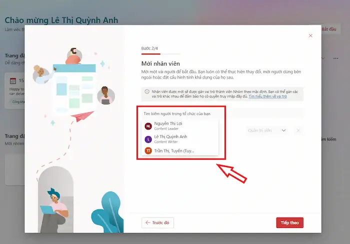 Bước 1: Click mục Tìm kiếm người trong tổ chức của bạn >> thêm các thành viên sẽ đảm nhiệm dịch vụ, gặp gỡ hoặc chăm sóc khách hàng.