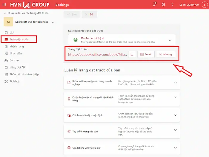 Bước 2: Tùy chọn mục Trang đặt trước. Lúc này, bạn sẽ nhận được một Liên kết đặt lịch (Booking Page URL) duy nhất. Chia sẻ liên kết này với khách hàng (qua email, mạng xã hội, hoặc nhúng vào trang web của bạn) để mọi người dễ dàng truy cập và đặt lịch.
