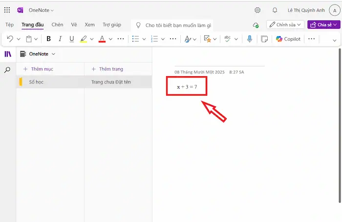- OneNote sẽ tự nhận dạng và chuyển phương trình viết tay thành dạng văn bản toán học.