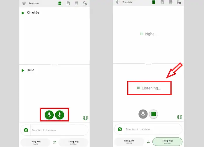 - Chế độ dịch song ngữ: Màn hình sẽ chia làm đôi. Mỗi người dùng một nửa màn hình và nhấn vào biểu tượng micro màu sắc tương ứng với ngôn ngữ của mình để nói. Ứng dụng sẽ hiển thị bản dịch cho người kia.