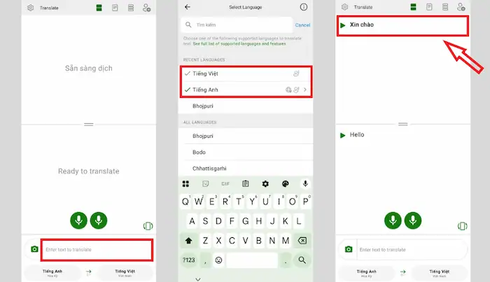 – Bước 3: Ở phía trên màn hình, chọn ngôn ngữ nguồn (ngôn ngữ bạn đang nhập) và ngôn ngữ đích (ngôn ngữ bạn muốn dịch sang).