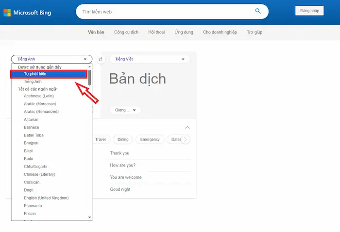 – Bước 2: Chọn ngôn ngữ nguồn và ngôn ngữ đích ở phía trên hai ô văn bản. Bạn có thể chọn Auto-Detect (Tự động phát hiện) cho ngôn ngữ nguồn.