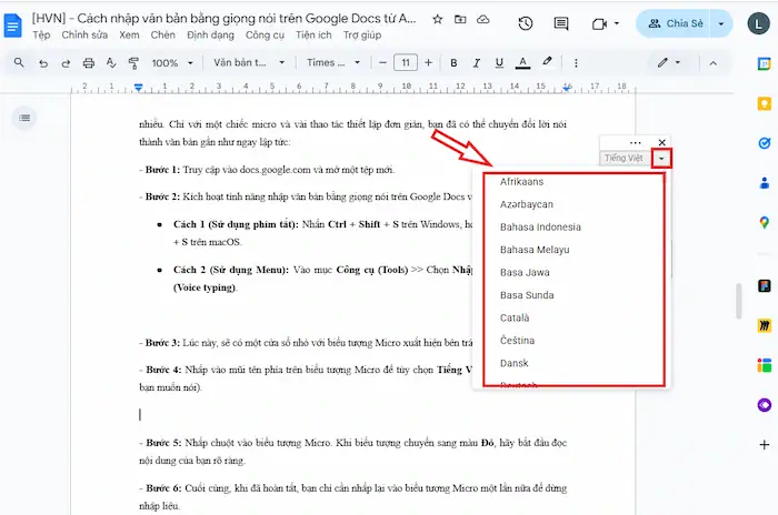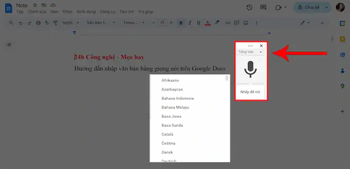 – Bước 4: Nhấp vào mũi tên phía trên biểu tượng Micro để tùy chọn Tiếng Việt (hoặc ngôn ngữ mà bạn muốn nói).