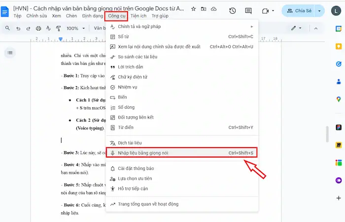 - Cách 2 (Sử dụng Menu): Vào mục Công cụ (Tools) >> Chọn Nhập liệu bằng giọng nói (Voice typing).