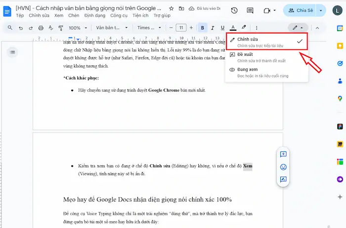 - Kiểm tra xem bạn có đang ở chế độ Chỉnh sửa (Editing) hay không, vì nếu ở chế độ Xem (Viewing), tính năng này sẽ bị ẩn đi.