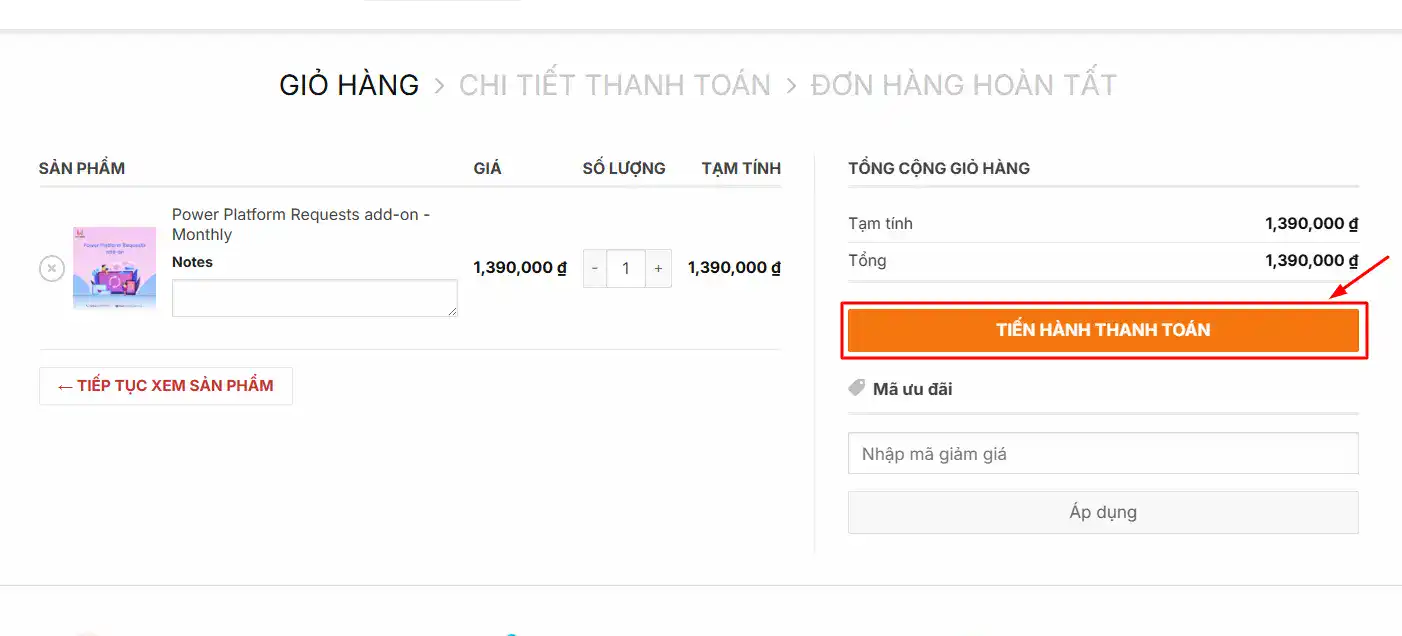 • Sau đó, trên trang “Giỏ hàng”, quý khách cần kiểm tra thông tin đơn hàng của mình, bao gồm tên + giá dịch vụ và số lượng giấy phép Power Platform Requests add-on – Monthly, rồi nhấn nút “TIẾN HÀNH THANH TOÁN”. Nếu cần điều chỉnh số giấy phép hay cần sử dụng mã ưu đãi cho đơn hàng của mình, quý khách hãy thực hiện trên trang này.