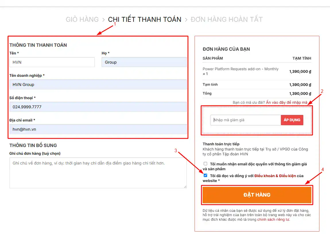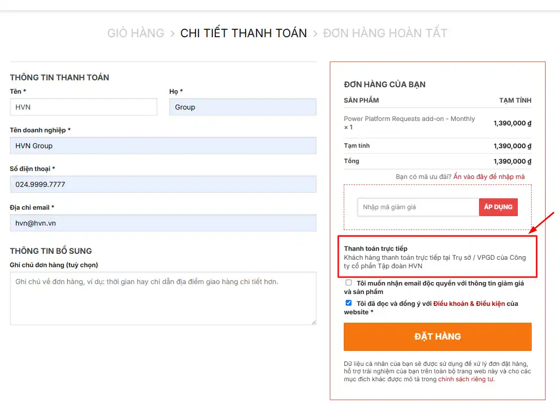 • Tại trang “Chi tiết thanh toán”, quý khách hãy điền đầy đủ thông tin thanh toán quan trọng liên quan, như họ tên, email và SĐT >> tiếp đến hãy tích chọn “Tôi đã đọc và đồng ý với Điều khoản & Điều kiện của website>> rồi nhấn “ĐẶT HÀNG” để hoàn tất. Tại trang này, quý khách vẫn có thể áp dụng mã giảm giá cho đơn hàng của mình tại HVN ở phần Nhập mã.