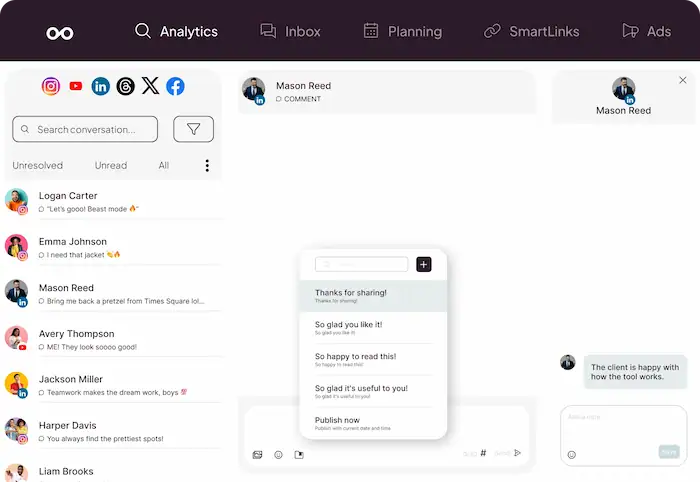 - Smart Inbox: Tất cả tin nhắn, bình luận từ các nền tảng mạng xã hội được gom về một hộp thư duy nhất, giúp phản hồi khách hàng nhanh chóng và chuyên nghiệp.