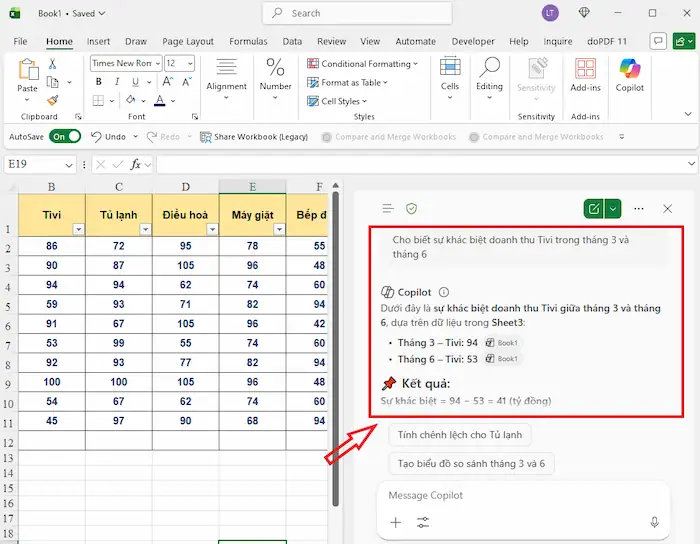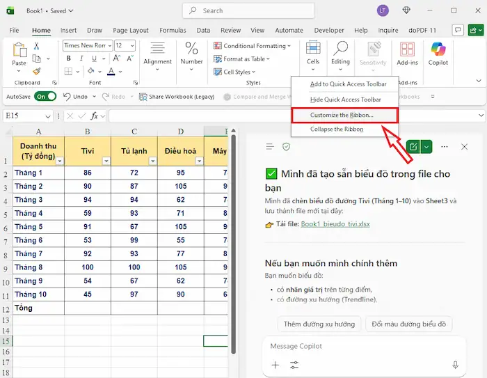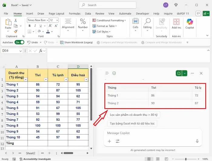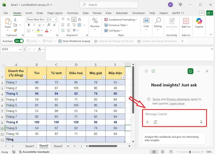- Đề xuất biểu đồ phù hợp: Dựa trên loại dữ liệu, Copilot sẽ gợi ý biểu đồ tối ưu như Column Chart, Line Chart, Pie Chart hoặc PivotTable để thể hiện thông tin rõ ràng nhất.