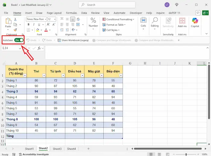 - Lưu tệp vào OneDrive (nút AutoSave ở góc trái trên cùng phải ở trạng thái On).