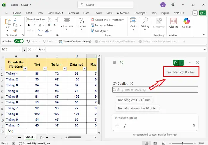 Hãy chia nhỏ yêu cầu thay vì ra lệnh một câu dài phức tạp, thực hiện từng bước (ví dụ: “Lọc cột A”, sau đó mới ra lệnh “Tính tổng cột B – Tivi”). Ngoài ra, bạn cũng nên sử dụng ngôn ngữ phổ thông với câu từ rõ ràng, rành mạch hoặc chuyển sang câu lệnh tiếng Anh nếu cần xử lý các hàm logic phức tạp.