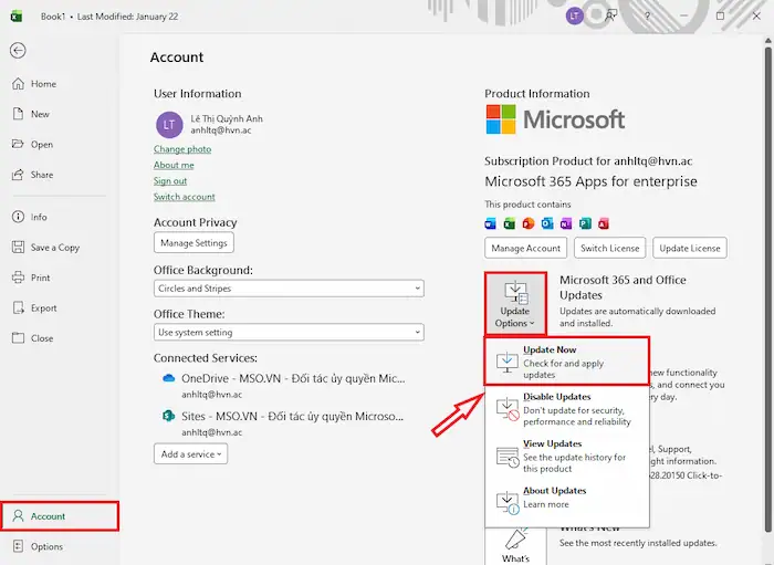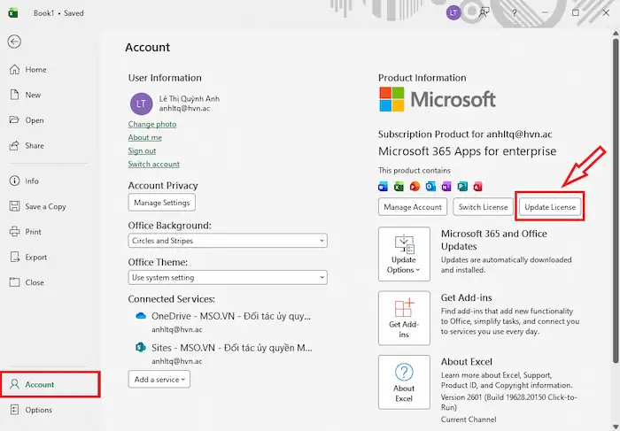 Click chọn File >> chọn Account và nhấn vào nút Update License. Nếu vẫn không được, hãy thử đăng xuất tài khoản Microsoft ra và đăng nhập lại để hệ thống “nhận diện” lại quyền hạn và gói dịch vụ bạn đã đăng ký.