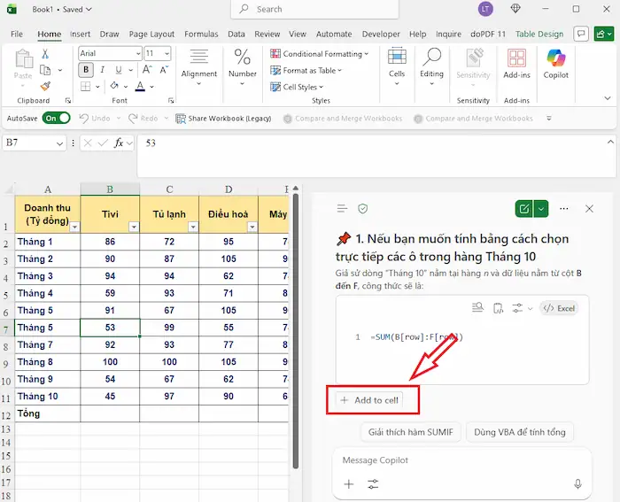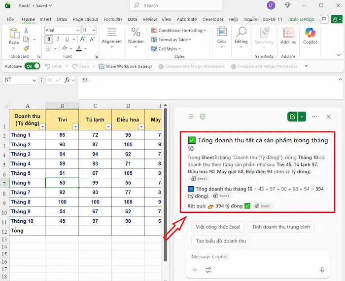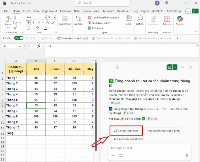 - Tự động viết công thức: Chỉ cần mô tả bằng ngôn ngữ tự nhiên như “Tính tổng doanh thu theo từng tháng” hoặc “So sánh doanh số năm nay với năm trước”, Copilot sẽ tự động tạo công thức phù hợp (SUMIFS, VLOOKUP/XLOOKUP, IF,…).