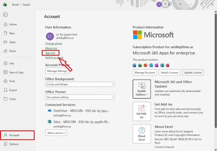 - Đăng xuất tài khoản: Hãy vào File >> chọn Account và đăng xuất tài khoản Microsoft 365 có đăng ký Copilot.