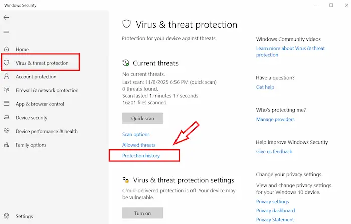 • Bạn có thể kiểm tra Lịch sử bảo mật trong ứng dụng Windows Security để xem chi tiết các hành động đã thực hiện.