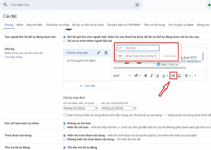 – Bước 2: Trong phần cài đặt Gmail, nhấp vào biểu tượng mạng xã hội >> chọn biểu tượng Liên kết (mắt xích) >> dán đường dẫn vào ô URL.