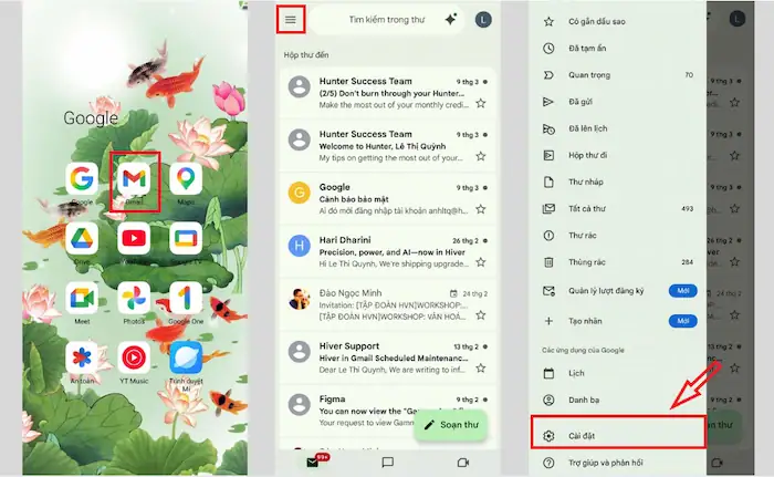 – Bước 1: Mở ứng dụng Gmail trên điện thoại (iOS hoặc Android) >> nhấp vào biểu tượng Menu (ba dấu gạch ngang) ở góc trên bên trái, cuộn xuống dưới cùng và chọn Cài đặt.