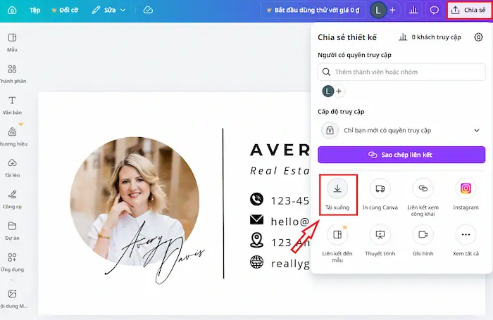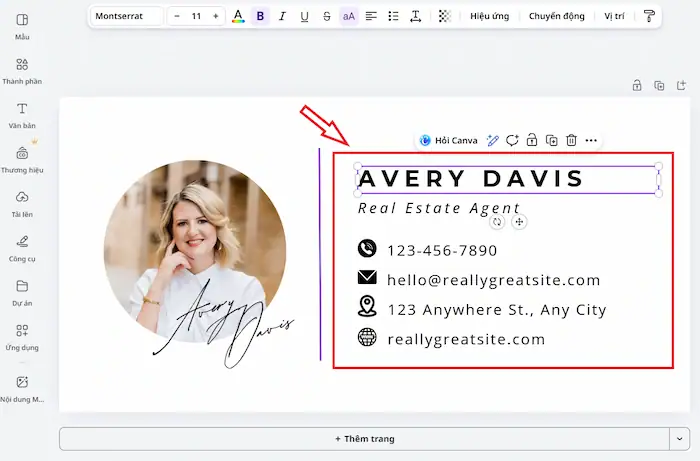 – Bước 2: Tùy chỉnh trực tiếp trên mẫu: Thay ảnh cá nhân bằng cách kéo thả, đổi màu sắc theo thương hiệu và sửa nội dung văn bản.