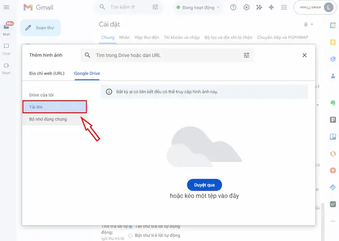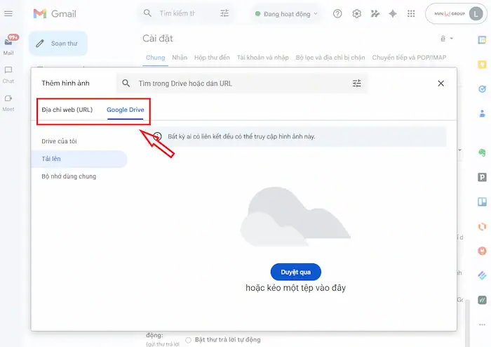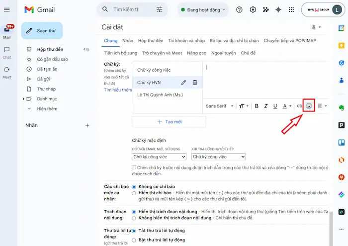 – Bước 4: Mở Gmail, vào phần cài đặt chữ ký và chọn Chèn hình ảnh để tải file vừa thiết kế từ máy tính lên.