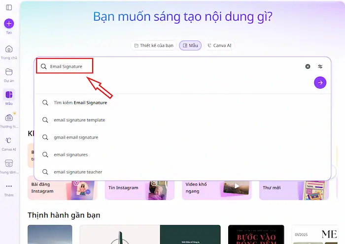 – Bước 1: Truy cập Canva và tìm kiếm từ khóa Email Signature. Hàng trăm mẫu thiết kế từ sang trọng đến hiện đại sẽ hiện ra để bạn lựa chọn.