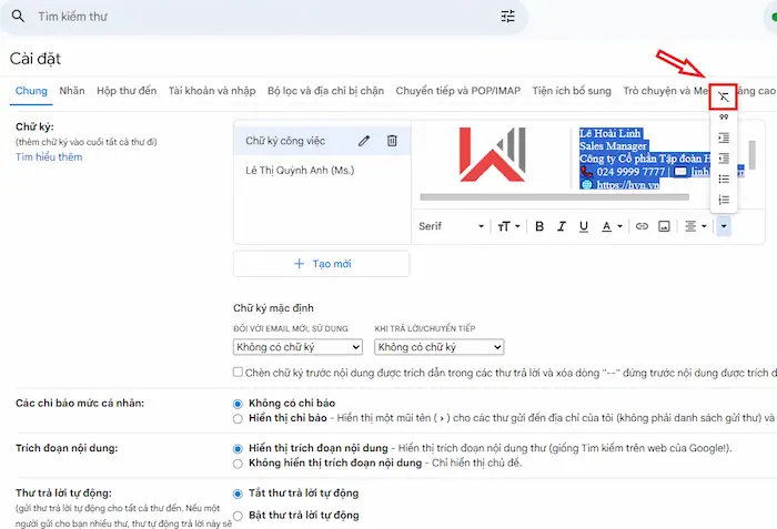 – Bước 1: Bôi đen toàn bộ chữ ký trong phần cài đặt, nhấn vào biểu tượng Xóa định dạng (chữ T có dấu gạch chéo) để loại bỏ các mã ẩn không cần thiết.