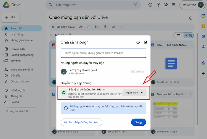 – Bước 2: Nếu bắt buộc dùng link Google Drive, bạn phải chuột phải vào ảnh trên Drive >> chọn Chia sẻ >> chuyển quyền truy cập thành Bất kỳ ai có liên kết đều có thể xem.