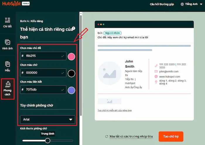 – Bước 5: Tùy chỉnh màu sắc, font chữ hoặc thêm lời kêu gọi hành động tại tab Phong cách để khớp với bộ nhận diện thương hiệu của bạn.