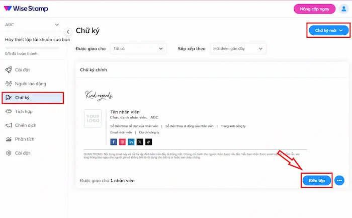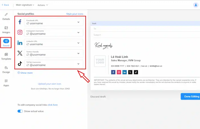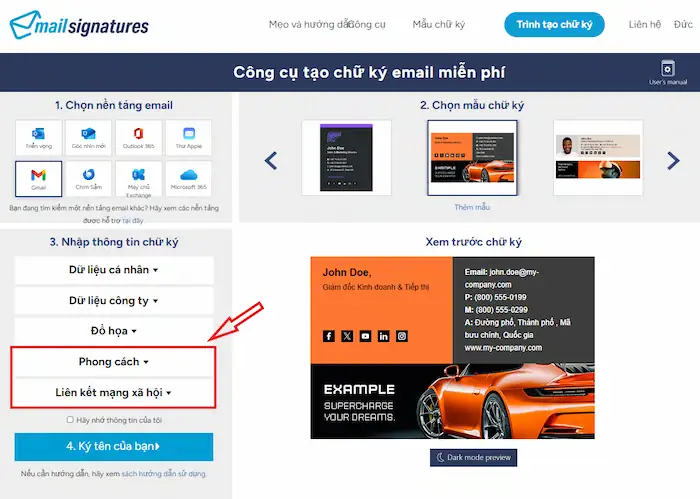 – Bước 5: Bạn cũng có thể tùy chỉnh phong cách chữ ký và thêm liên kết mạng xã hội để tăng tính chuyên nghiệp ngay tại mục này.