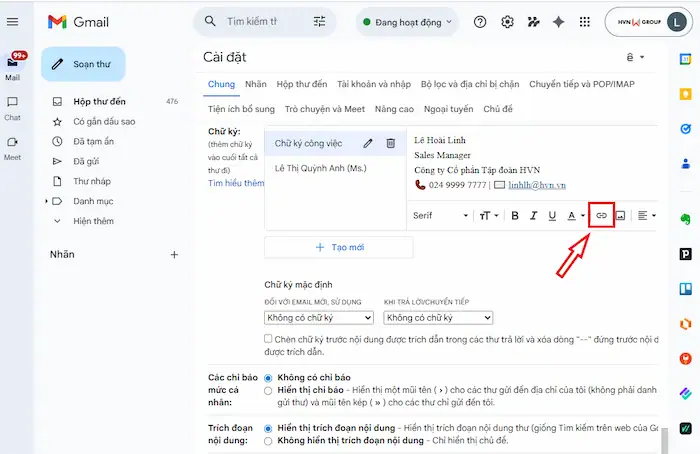 Trong khung soạn thảo chữ ký, bạn hãy chọn (bôi đen) hình ảnh icon đó, sau đó nhấn vào biểu tượng Liên kết (Hình mắt xích) trên thanh công cụ và dán đường dẫn trang cá nhân của bạn vào. Hãy nhớ kiểm tra lại link sau khi lưu.