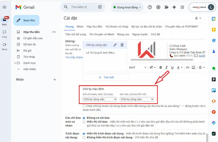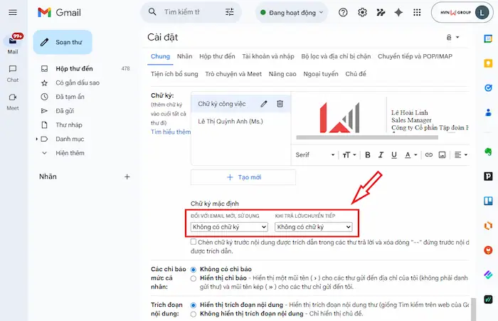 – Bước 6: Tại mục Chế độ mặc định của chữ ký, hãy chọn tên chữ ký bạn vừa tạo cho cả hai phần “Đối với email mới” và “Đối với email trả lời/chuyển tiếp”.