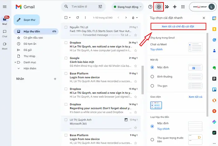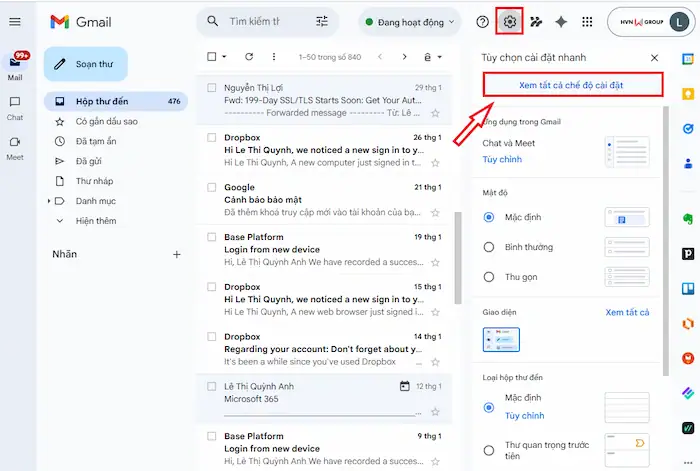 – Bước 1: Đăng nhập Gmail >> click biểu tượng Cài đặt (hình bánh răng) ở góc trên bên phải và chọn Xem tất cả chế độ cài đặt.