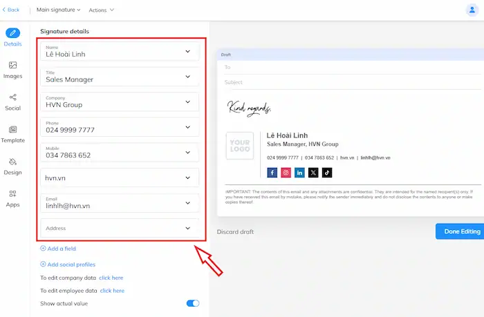 – Bước 3: Chuyển sang tab Chi tiết (biểu tượng văn bản) để thực hiện tùy chỉnh các trường thông tin trong chữ ký như Họ tên, chức vụ, tên công ty, số điện thoại và địa chỉ website.