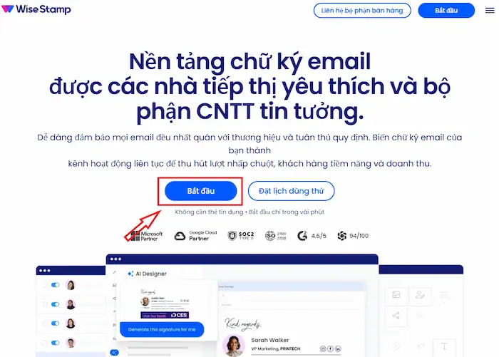 – Bước 1: Vào trang chủ WiseStamp và nhấn chọn Bắt đầu >> thực hiện theo các bước hướng dẫn để hoàn tất đăng ký tài khoản.