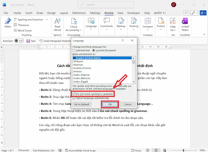 – Bước 5: Nhấn OK để hoàn tất cài đặt tắt kiểm tra lỗi chính tả cho đoạn văn.