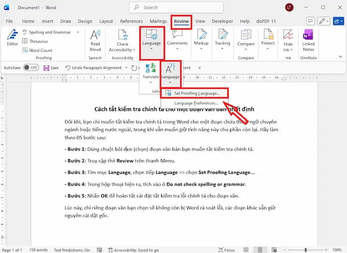 Đôi khi, bạn chỉ muốn tắt kiểm tra chính tả trong Word cho một đoạn chứa thuật ngữ chuyên ngành hoặc tiếng nước ngoài, trong khi vẫn muốn giữ tính năng này cho phần còn lại. Hãy làm theo 05 bước sau: