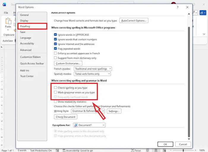 *Lời khuyên: Nếu bạn chỉ muốn tắt tạm thời cho một buổi thuyết trình, hãy sử dụng tính năng Hide spelling errors in this document only trong phần Word Options >> Proofing. Điều này giúp ẩn đi các lỗi mà không làm thay đổi cài đặt hệ thống của bạn về lâu dài.