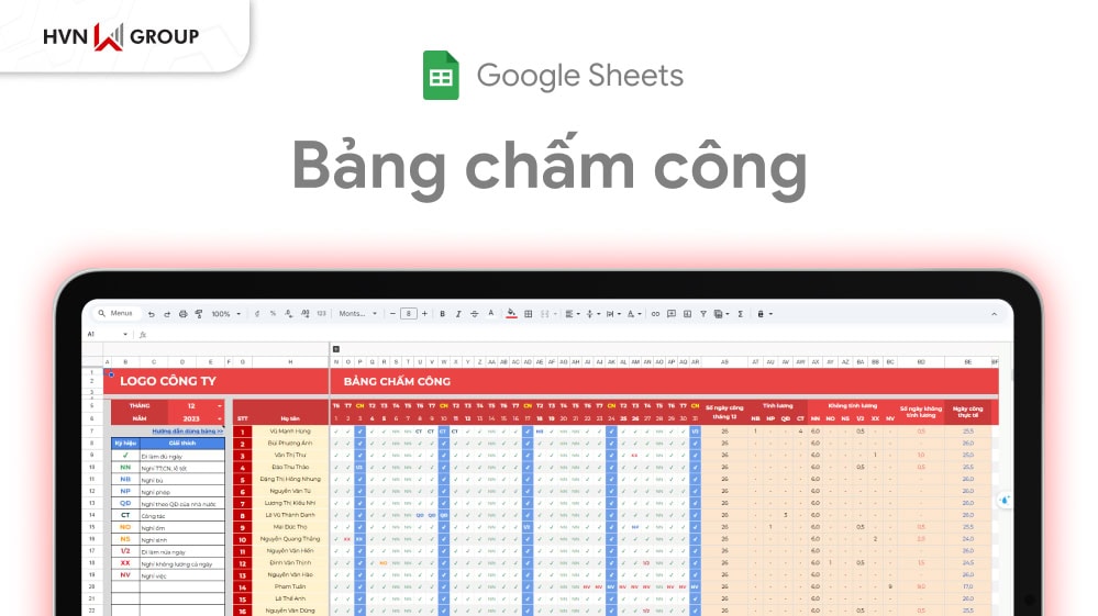 Tại mỗi doanh nghiệp, việc theo dõi thời gian làm việc của nhân sự trở thành nhiệm vụ thiết yếu để kiểm soát được số ngày, giờ làm việc của nhân sự cũng như những ngày nghỉ, tình trạng đi muộn/về sớm,… cũng như tăng tính minh bạch, tạo số liệu cho những quyết định quan trọng như tăng lương, thăng chức. Tuy nhiên để tạo được một bảng theo dõi như vậy rất mất thời gian và nguồn lực nên HVN Group đã tạo ra sản phẩm miễn phí dành tặng các doanh nghiệp là template Bảng chấm công mới nhất hiện nay.