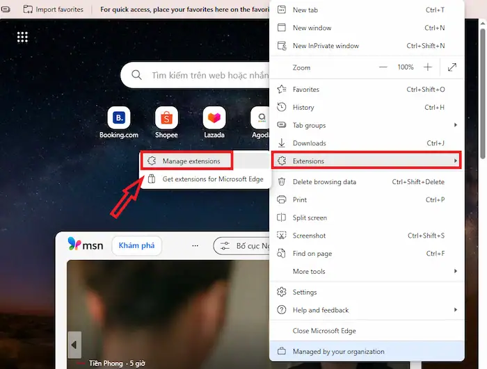 – Bước 1: Nhấn vào biểu tượng dấu ba chấm (…) >> chọn Tiện ích mở rộng >> chọn Quản lý Tiện ích mở rộng.