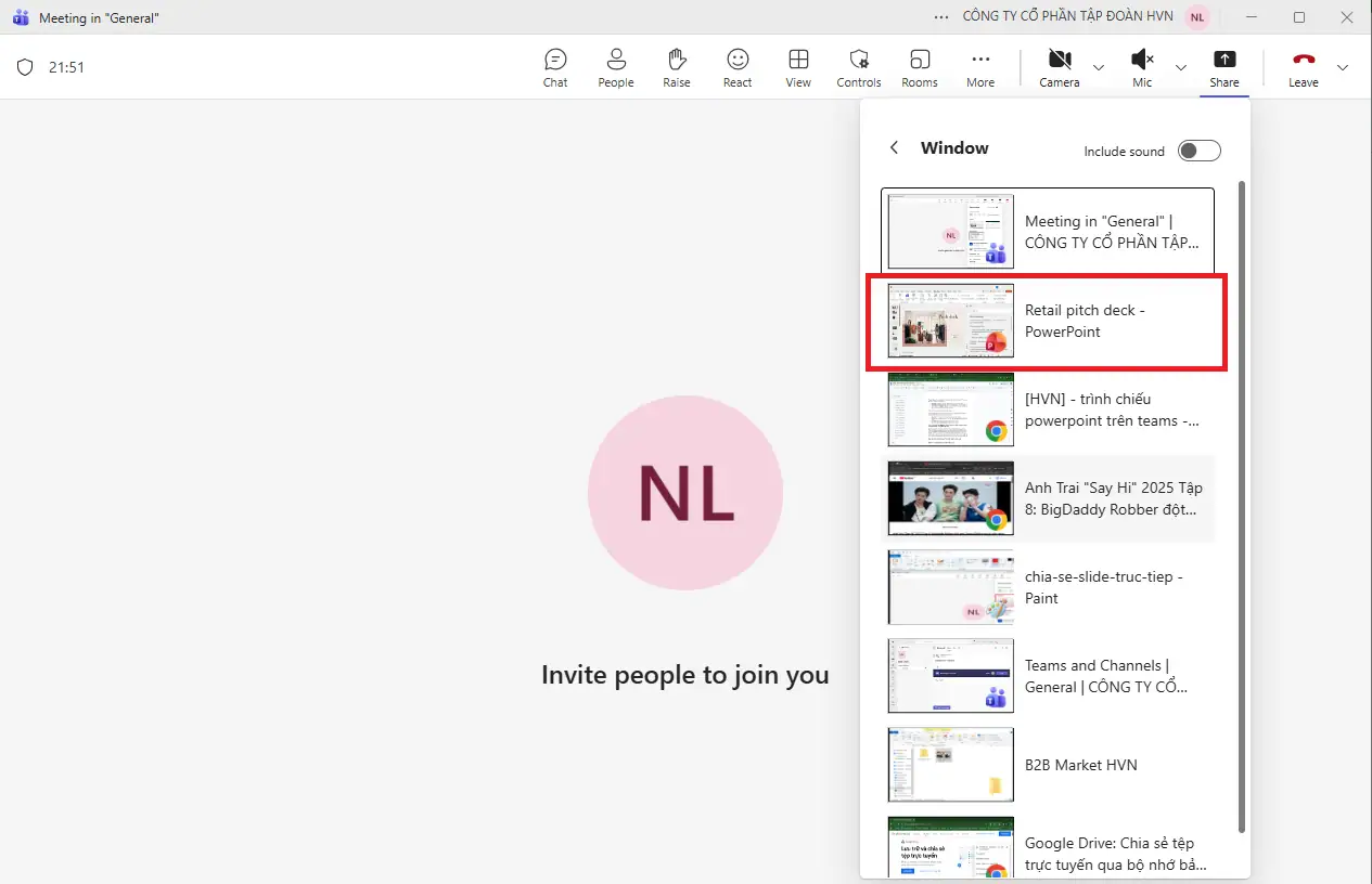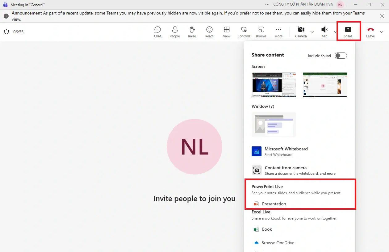 Đây là cách hiện đại và chuyên nghiệp nhất khi trình chiếu PowerPoint trên Teams. Bạn có thể tải file PowerPoint trực tiếp lên cuộc họp và sử dụng chế độ PowerPoint Live để điều khiển slide, xem ghi chú và theo dõi phản ứng của người tham dự mà không cần chia sẻ toàn màn hình. - Chia sẻ cửa sổ PowerPoint qua Share Screen