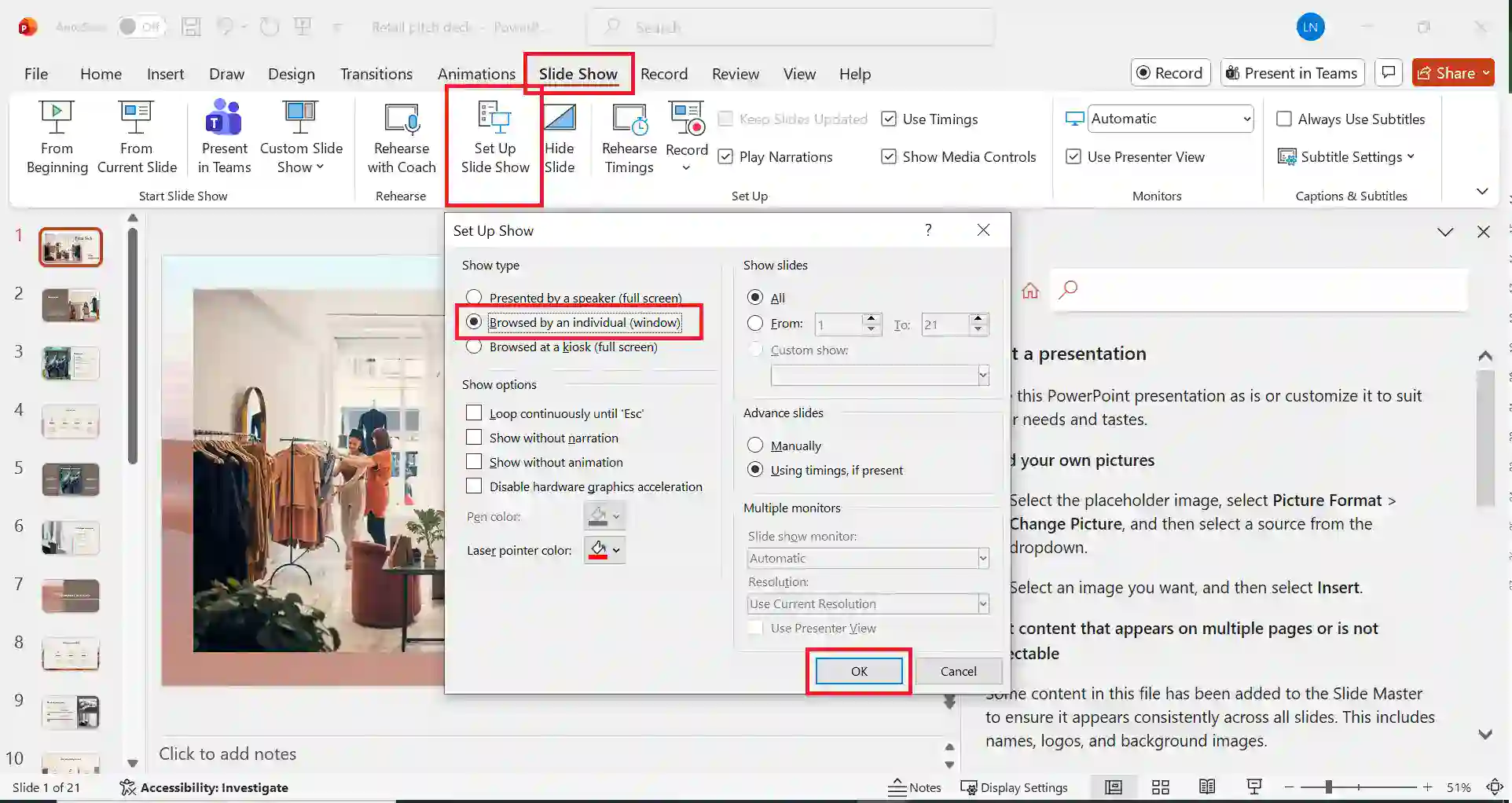 - Mở file PowerPoint và chuyển nó sang chế độ Trình chiếu trong cửa sổ thay vì toàn màn hình.