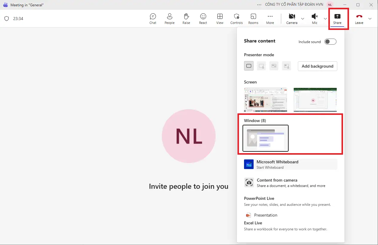 Bước 2: Chia sẻ Cửa sổ trên Teams