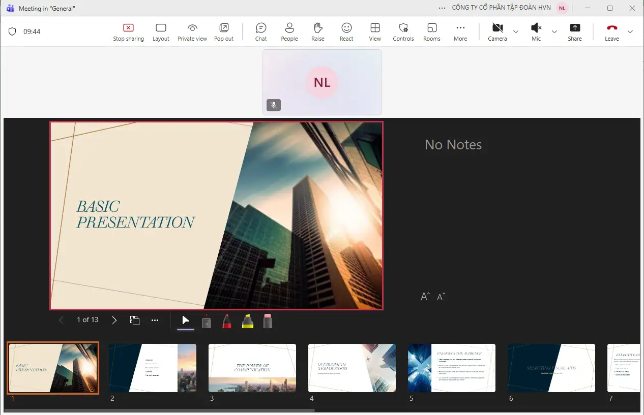 - Màn hình của bạn hiển thị: Slide hiện tại (trung tâm), các ghi chú (Notes) cá nhân (bên phải), hàng loạt slide thu nhỏ (dưới cùng), và công cụ Laser/Viết tay.