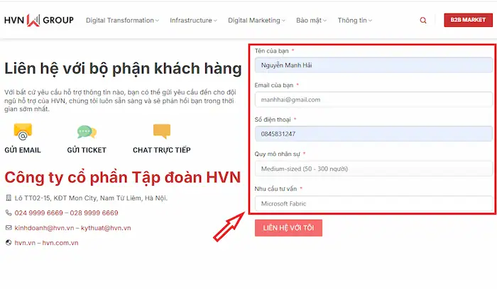 – Bước 3: Sau khi kiểm tra tính chính xác của thông tin, bạn hãy nhấn nút Liên hệ với tôi. Hệ thống của HVN Group sẽ ghi nhận yêu cầu và gửi một thông báo xác nhận tự động qua email của bạn.