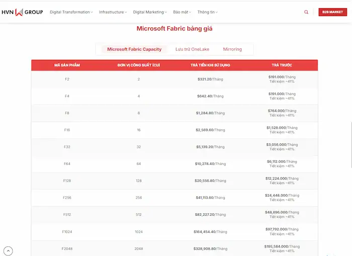 Gói thấp nhất hiện tại là F2. Chi phí này rơi vào khoảng $156/tháng (nếu mua trả trước 1 năm) hoặc khoảng $262/tháng (nếu trả theo giờ). Lưu ý, bạn sẽ cần cộng thêm chi phí lưu trữ OneLake (khoảng $0.023/GB/tháng).