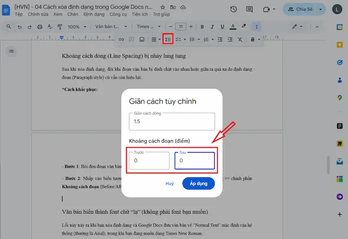 – Bước 2: Nhấp vào biểu tượng Giãn dòng và đoạn >> chọn Giãn cách tùy chỉnh >> chỉnh phần Khoảng cách đoạn (Before/After) về số 0.