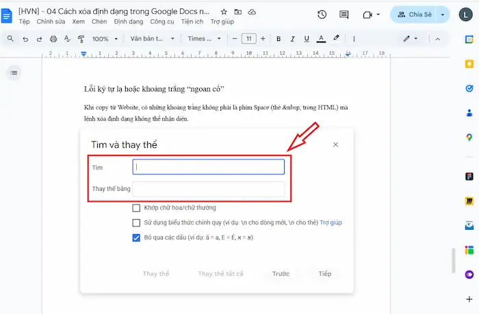 – Bước 1: Copy khoảng trắng lỗi đó dán vào ô “Tìm kiếm” và để trống ô “Thay thế bằng”.