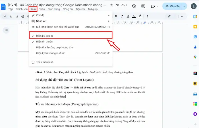 Hãy luôn thiết lập chế độ Xem >> Hiển thị bố cục in để kiểm tra xem văn bản có bị nhảy trang vô lý hay không. Điều này cực kỳ quan trọng nếu bạn có ý định xuất file sang PDF hoặc in ấn sau khi đã xóa và chỉnh sửa định dạng.