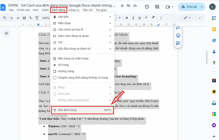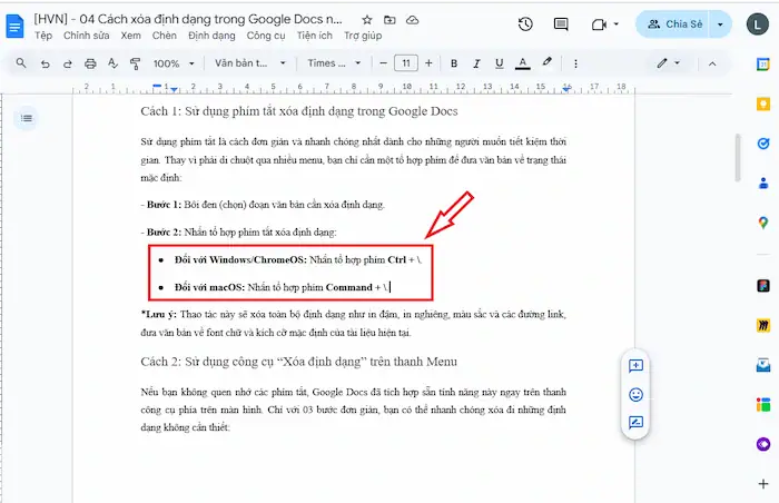 Cách 1: Sử dụng phím tắt xóa định dạng trong Google Docs