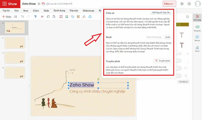 Bạn có thể chia sẻ bài thuyết trình trên Zoho Show bằng nhiều cách, cụ thể như: