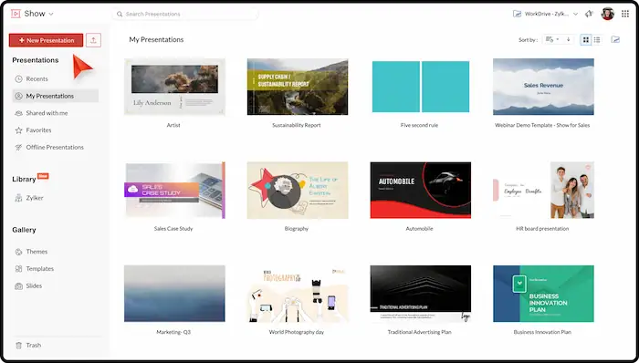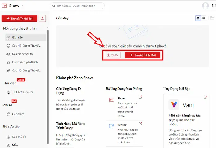 Sau khi đăng nhập thành công, bạn có thể bắt đầu tạo ra bài thuyết trình của mình. Zoho Show cung cấp nhiều tùy chọn để bạn bắt đầu một cách nhanh chóng: